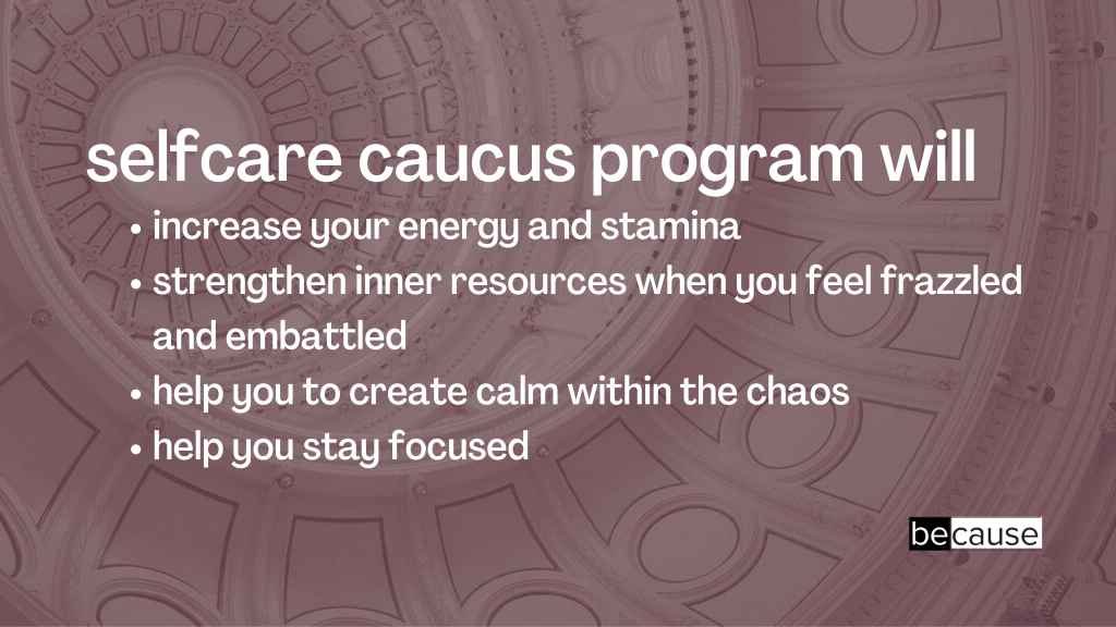 The Selfcare Caucus program is designed to increase your energy and stamina for the long days, strengthen inner resources for when you feel frazzled and embattled, teach you and remind you to create calm for yourself when there is chaos all around.